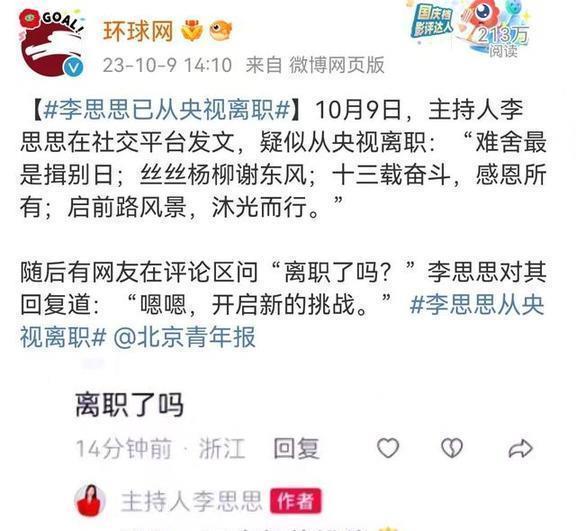 就在大伙儿都以为李思思会接着董卿的班,在央视一直干下去的时候,她从央视辞职的消息突然就冒出来了。这一下可不得了,网上跟炸开了锅似的,各种猜测她为啥要离职的声音到处都是,说得跟真的一样。
